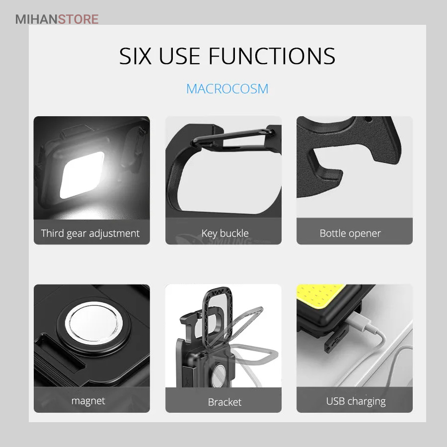 مینی چراغ پر قدرت چندکاره COB محصول کاربردی برای استفاده در کمپینگ و مسافرت های بیرون شهری حتی داخل منزل است. این مدل پروژکتور با طراحی و کیفیت عالی خود در مسافرت ها و گردشگری و همچنین درموارد اضطراری همچون نبودن برق, به سهولت مورد استفاده قرار میگرد. این پروژکتور COB با سه حالت نوردهی بصورت ثابت (پر نور , کم نور) و چشمک زن (SOS) محیط اطراف خود را به طور کامل روشن می کند. در پشت این محصول یک آهنربا پر قدرت و یک دسته تعبیه شده است که طراحی آهنربا به این محصول اجازه می دهد تا به هر فلزی متصل شود شما میتوانید به سرعت آن را به یک سطح فلزی، حتی وارونه (مثلاً به سقف یا کاپوت ماشین) متصل کنید و دسته قابل تاشو 180 درجه اجازه می دهد تا لامپ در زوایای مختلف قرار گیرد یا در  مکان های خاصی آویزان شود ومحیط را کاملا روشن کند.