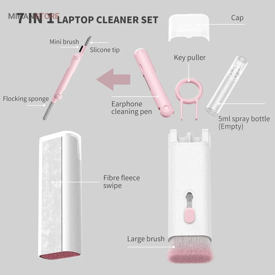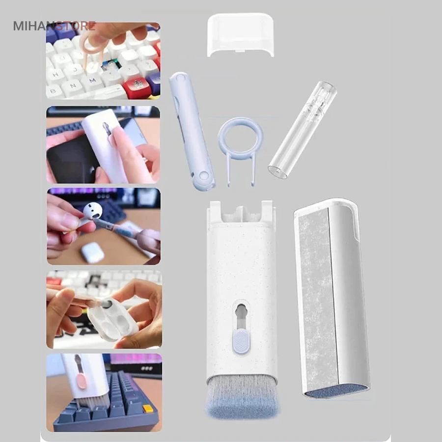 این کیت تمیزکننده 7 کاره شامل 1 برس بزرگ با تراکم بالا، 1 عدد پد تمیز کننده فیبری (مخصوص سطوح مانند مانیتور) ، 1 قلم تمیز کننده گوشی (شامل نوک فلزی، اسفنج و مینی برس با چگالی بالا)، 1 عدد کلیدکش کیبورد و 1 بطری اسپری می باشد. این سرویس پاک کننده چند منظوره می تواند هر خواسته شما را برای تمیز کردن وسایل الکترونیکی برآورده کند. اولین ابزار یک خودکار تمیزکننده تاشو با نوک سیلیکونی، برس کوچک سخت و اسفنج جمعکننده کثیفی ها ، مناسب برای تمیز کردن ایرپاد و سایر هدفونها یا هندزفری ها. نوک سیلیکونی برای تمیز کردن لکه های شکاف است. دومین ابزار برس کوچک برای تمیز کردن گرد و غبار سطوح عمیق و اسفنج دسته دار برای تمیز کردن حفره های کیس شارژ ایرپاد ها میباشد. ابزار سوم تمیز کننده لپ تاپ، رایانه، تبلت و صفحه کلید می باشد کافیست برس نرم بزرگ را بکشید تا گرد و غبار روی رایانه، لپ تاپ، تبلت و صفحه کلید پاک شود. و همچنین می توانید از کلیدکش کیبورد جدا کردن کلیدهای صفحه کلید مکانیکی برای انجام این کار استفاده کنید. ابزار بعدی تمیز کننده مانیتور، صفحه نمایش، دوربین، ساعت و تلویزیون میباشد: در کنار یک بطری خالی اسپری 5 میلیلیتری، مایع تمیزکننده یا آب را درون بطری قرار میدهید و از صفحه فیبری برای تمیز کردن صفحههای مختلف استفاده میکنید. به عنوان مثال صفحات نمایش ، تلویزیون، ساعت، دوربین و غیره.اندازه جمع و جور و سبک وزن: 7 ابزار تمیز کردن کامپیوتر به طور مرتب در یک جعبه مستطیلی قرار گرفته اند. اندازه کیت پاک کننده فقط 4.88 * 1.73 * 1.18 اینچ و وزن آن تقریبا 80 گرم است. برای سفر به اندازه کافی کوچک است و می توانید آن را حمل کنید. در همین حال، شما همچنین می توانید هر ابزار تمیز کننده ای را به طور جداگانه بیرون بیاورید.