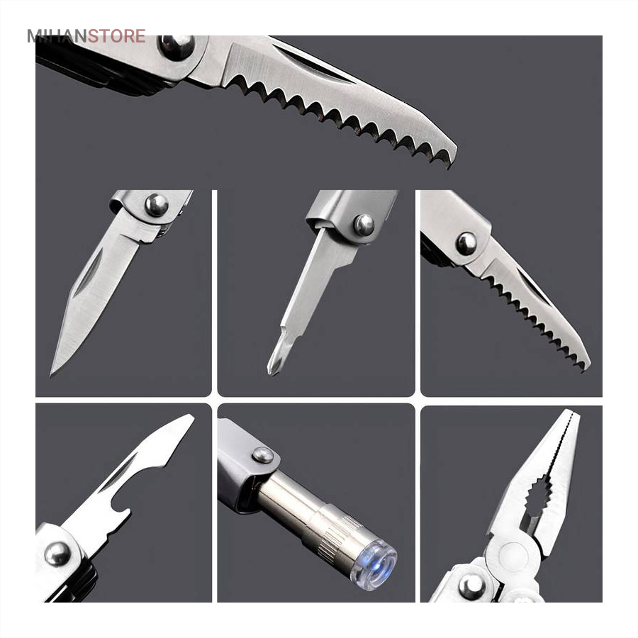 انبردست، چاقو، پیچ گوشتی، درب باز کن، اره و چراغ قوه