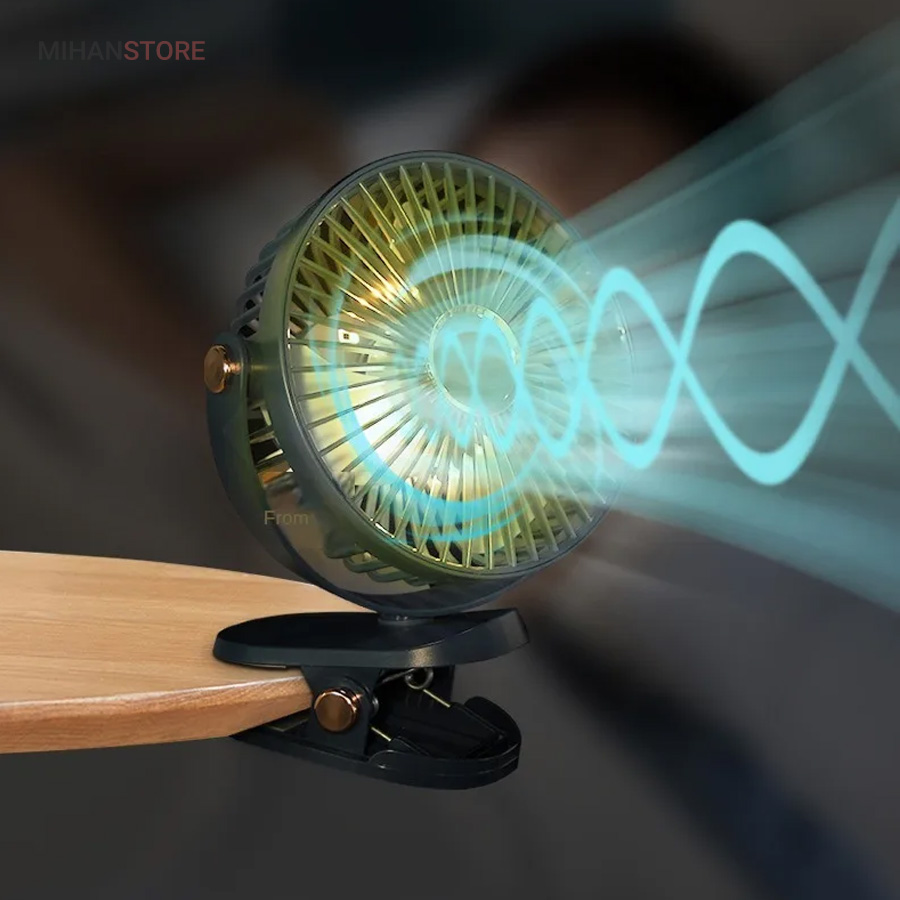 این پنکه می تواند گزینه مناسبی برای زمانی باشد که شما به برق دسترسی ندارید و یا برق رفته است. باطری این پنکه شارژ می شود و می توانید از آن بدون نیاز به اتصال مداوم به برق استفاده کنید. قدرت پرتاب هوا توسط پره های این پنکه با توجه به ساخت متفاوت بسیار بالا است و گردش هوای مناسب و قوی تری ایجاد می کند.این پنکه قدرت انتخاب سه سرعت را به فرد می دهد که با توجه به شرایط فرد انتخاب می کند کدام سرعت را تنظیم کرده و استفاده کند.دارای گیره اتصال برای متصل نمودن به میز یا دستگیره و یا دسته صندلی یا داخل ماشیناین پنکه از سایز خوبی برخوردار است که می توان آن را داخل کیف قرار داده و با خود حمل کنید.یکی دیگر از ویژگی های این پنکه حالت چرخش 360 درجه آن است که با توجه به نیازتان می توانید جهت آن را تنظیم کنید. این پنکه دارای LED در داخل پنکه می باشد که هنگام کار کردن زیبایی خاصی به محصول می بخشد.
