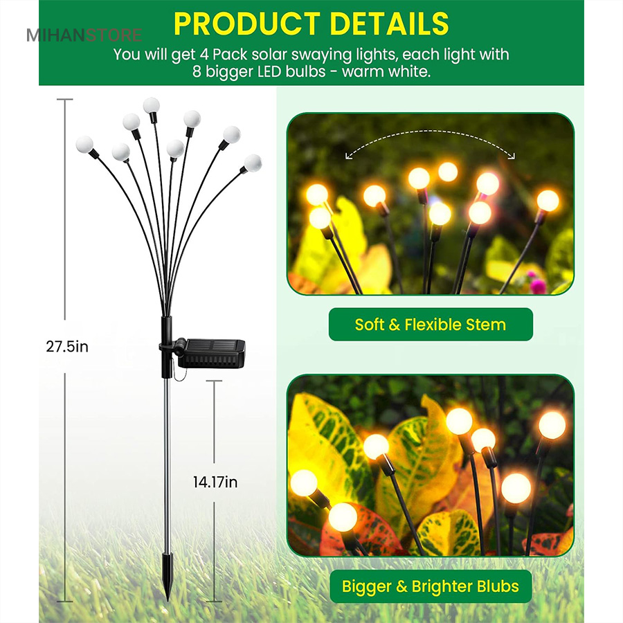 چراغ خورشیدی باغچه مدل گل شب تاب با طراحی جدید محصولی جذاب و کاربردی و ضد آب است.این چراغ با دارا بودن 8 لامپ LED از جنس ABS و بهره گیری از پنل خورشیدی خود ، انرژی رایگان خورشیدی را در طول روز در باتری داخلی خود ذخیره کرده و پس از غروب آفتاب با فرمان سنسور فتوسل موجود در پنل خورشیدی فعال میشود. محصول را میتوانید در هرجایی با نور مستقیم خورشید مثل حیاط ، باغ ، ویلا و بالکن نصب یا قرار داد و در طول شب از نور آن بهره برد. پشت پنل دکمه ON/OFF قرار دارد که با قرار دادن در حالت ON روشن و OFF خاموش میشود. شاخه های چراغ باغی شب تاب به هنگام وزش باد در تاریکی شب تکان میخورند، و با نور درخشان و زیبا، خانه و باغ شما را هر شب ستاره دار میکند و جلوه ای خاص به فضای باغ و ویلای شما میبخشد.