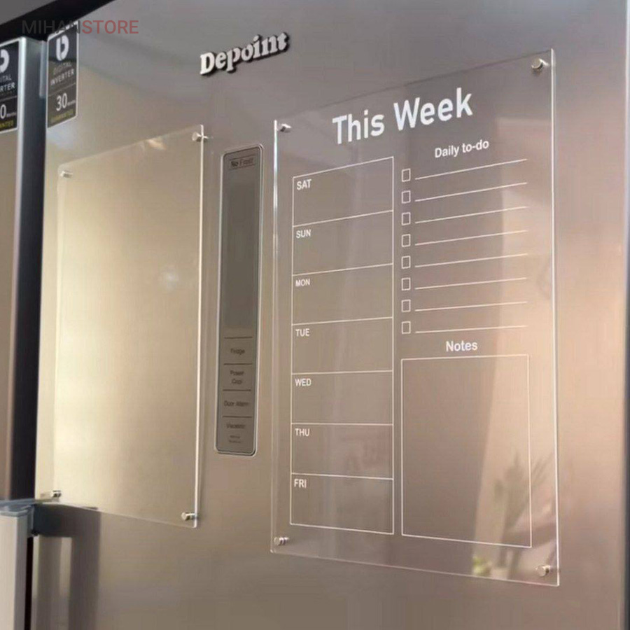 تخته برنامه ریزی هفتگی مغناطیسی شفاف این امکان را به شما می دهد تا با داشتن یک برنامه ی منظم هفتگی کارهای خود را سازمان دهی کنید.همچنین با داشتن بخش جزییات کارهای روزانه به شما در طبقه بندی، رسیدگی و انجام کارهای تان کمک می کند. امکان ثبت رویداد های هفته ،ثبت قرار ملاقات و دارا بودن بخش یادداشت های متفرقه از مزیت های این محصول است . پلکسی گلس اجرا شده در این محصول به ضخامت دو میلی متر است و در آن چهار عدد آهن ربای نئودیمیوم درجه یک بکار رفته است . آهن ربای این محصول با قدرت بالا نسبت به وزن محصول احتمال سرخوردگی را به صفر می رساند. طرح چاپ شده در دو رنگ سفید و مشکی در پشت پلکسی گلس اجرا شده است. با یک ماژیک وایت برد قابلیت نوشتن و پاک کردن مکرر روی این تخته وجود دارد.