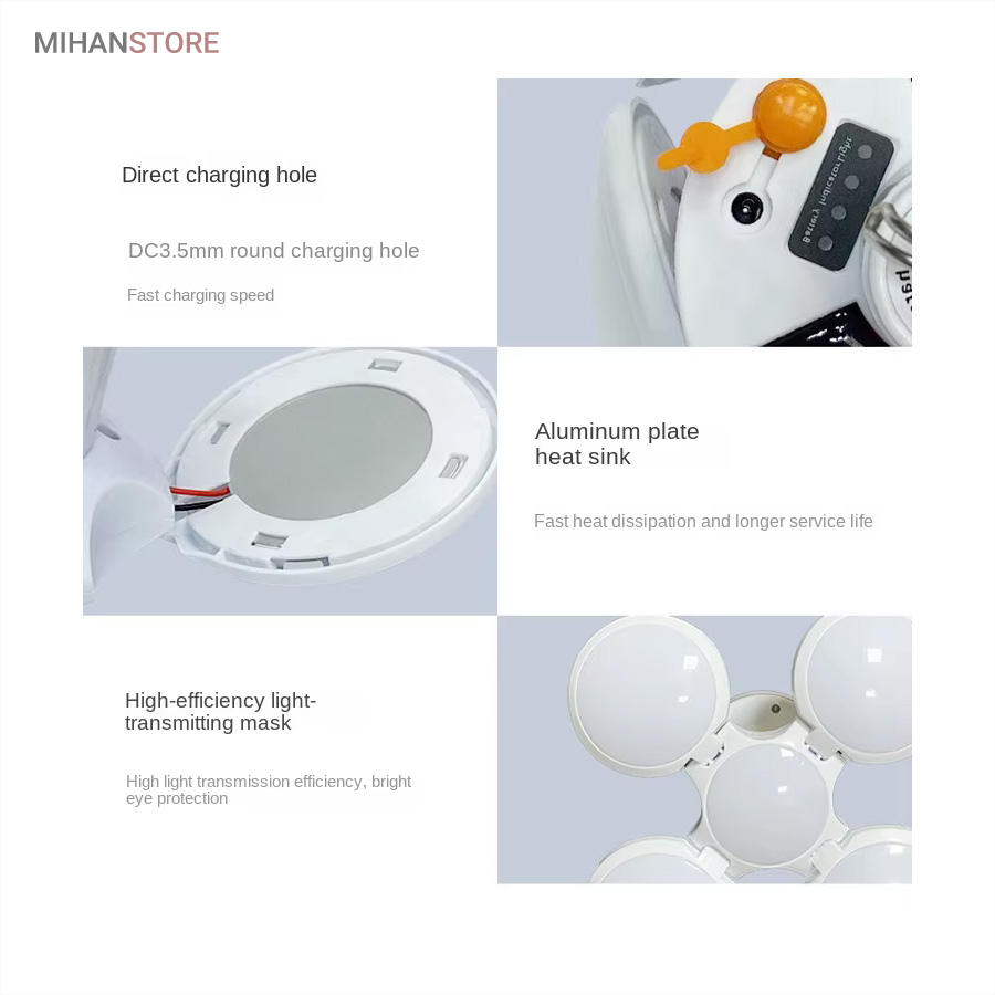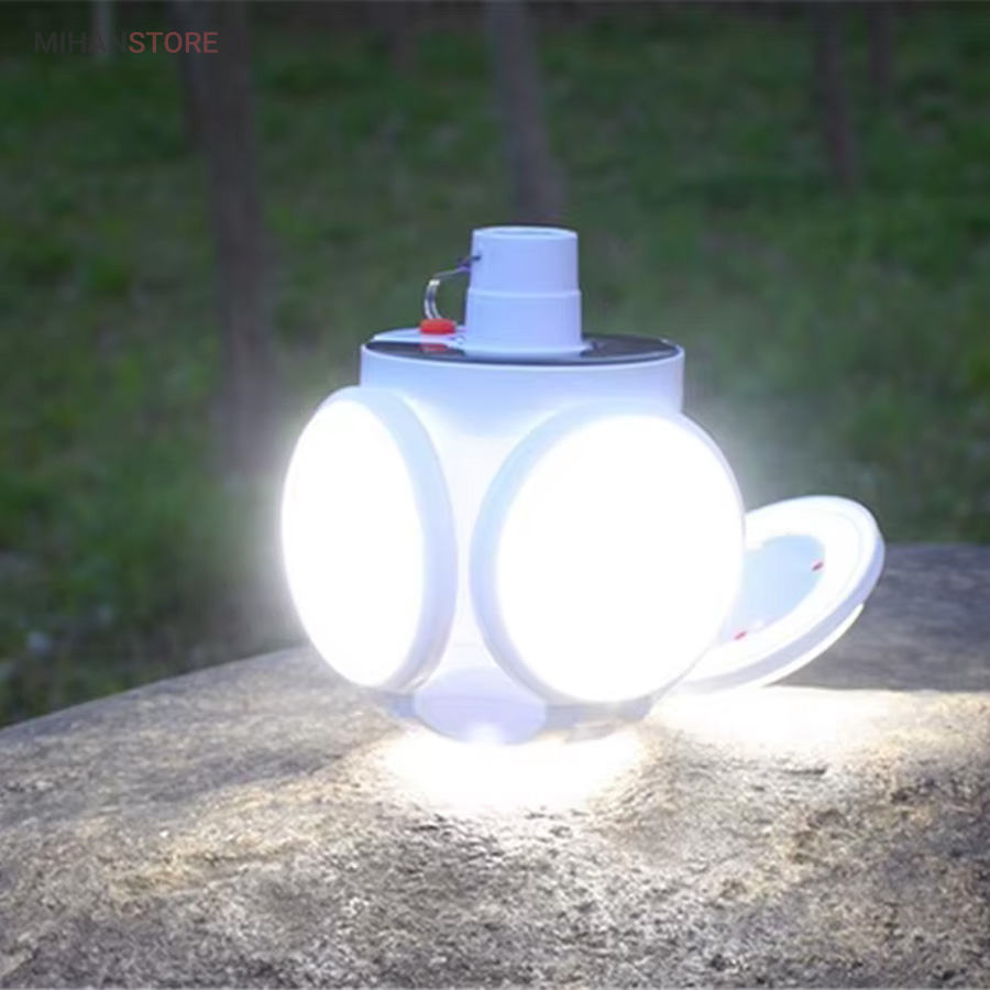 از ویژگی های دیگر این لامپ داشتن صفحه سولار می باشد و این خود می تواند بهترین کمک را در ذخیره انرژی داشته باشد، همچنین دارای میزان روشنایی 800 لومن و چراغ نشانگر شارژ در قسمت بالای لامپ نیز می باشد. منبع تغذیه لامپ توسط پنل خورشیدی و همچنین آداپتور می باشد. برای شارژ کامل لامپ، 5 ساعت زمان لازم است و با هر بار شارژ کامل، می توانید به مدت 6 تا 8 ساعت از نور آن استفاده کنید. باز شدن چهار ال ای دی این چراغ سولار زیبایی آن را دوچندان کرده است.سایز لامپ در حالت بسته (مدل توپ) 16x14x16 سانتیمتر میباشد در حالت سقفی باز 30x16x30 سانتیمتر می باشد.