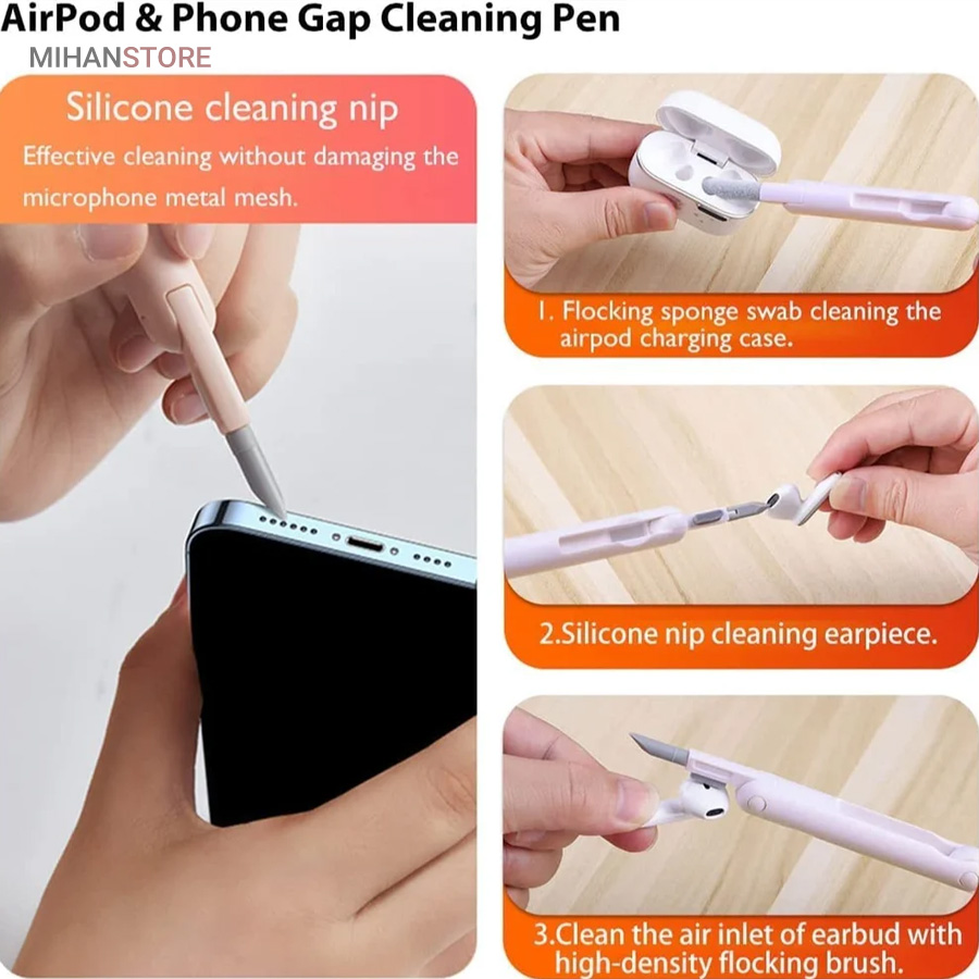 این کیت تمیزکننده 7 کاره شامل 1 برس بزرگ با تراکم بالا، 1 عدد پد تمیز کننده فیبری (مخصوص سطوح مانند مانیتور) ، 1 قلم تمیز کننده گوشی (شامل نوک فلزی، اسفنج و مینی برس با چگالی بالا)، 1 عدد کلیدکش کیبورد و 1 بطری اسپری می باشد. این سرویس پاک کننده چند منظوره می تواند هر خواسته شما را برای تمیز کردن وسایل الکترونیکی برآورده کند. اولین ابزار یک خودکار تمیزکننده تاشو با نوک سیلیکونی، برس کوچک سخت و اسفنج جمعکننده کثیفی ها ، مناسب برای تمیز کردن ایرپاد و سایر هدفونها یا هندزفری ها. نوک سیلیکونی برای تمیز کردن لکه های شکاف است. دومین ابزار برس کوچک برای تمیز کردن گرد و غبار سطوح عمیق و اسفنج دسته دار برای تمیز کردن حفره های کیس شارژ ایرپاد ها میباشد. ابزار سوم تمیز کننده لپ تاپ، رایانه، تبلت و صفحه کلید می باشد کافیست برس نرم بزرگ را بکشید تا گرد و غبار روی رایانه، لپ تاپ، تبلت و صفحه کلید پاک شود. و همچنین می توانید از کلیدکش کیبورد جدا کردن کلیدهای صفحه کلید مکانیکی برای انجام این کار استفاده کنید. ابزار بعدی تمیز کننده مانیتور، صفحه نمایش، دوربین، ساعت و تلویزیون میباشد: در کنار یک بطری خالی اسپری 5 میلیلیتری، مایع تمیزکننده یا آب را درون بطری قرار میدهید و از صفحه فیبری برای تمیز کردن صفحههای مختلف استفاده میکنید. به عنوان مثال صفحات نمایش ، تلویزیون، ساعت، دوربین و غیره.اندازه جمع و جور و سبک وزن: 7 ابزار تمیز کردن کامپیوتر به طور مرتب در یک جعبه مستطیلی قرار گرفته اند. اندازه کیت پاک کننده فقط 4.88 * 1.73 * 1.18 اینچ و وزن آن تقریبا 80 گرم است. برای سفر به اندازه کافی کوچک است و می توانید آن را حمل کنید. در همین حال، شما همچنین می توانید هر ابزار تمیز کننده ای را به طور جداگانه بیرون بیاورید.