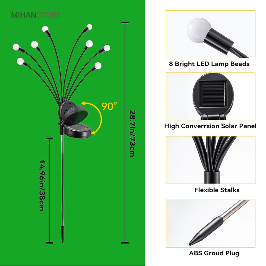 چراغ خورشیدی باغچه مدل گل شب تاب با طراحی جدید محصولی جذاب و کاربردی و ضد آب است.این چراغ با دارا بودن 8 لامپ LED از جنس ABS و بهره گیری از پنل خورشیدی خود ، انرژی رایگان خورشیدی را در طول روز در باتری داخلی خود ذخیره کرده و پس از غروب آفتاب با فرمان سنسور فتوسل موجود در پنل خورشیدی فعال میشود. محصول را میتوانید در هرجایی با نور مستقیم خورشید مثل حیاط ، باغ ، ویلا و بالکن نصب یا قرار داد و در طول شب از نور آن بهره برد. پشت پنل دکمه ON/OFF قرار دارد که با قرار دادن در حالت ON روشن و OFF خاموش میشود. شاخه های چراغ باغی شب تاب به هنگام وزش باد در تاریکی شب تکان میخورند، و با نور درخشان و زیبا، خانه و باغ شما را هر شب ستاره دار میکند و جلوه ای خاص به فضای باغ و ویلای شما میبخشد.
