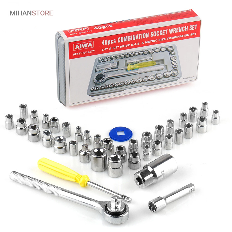 این مجموعه ست کامل ابزار و آچار بکس است که یک جعبه کامل از ابزار و آچار های مختلف برای استفاده انواع خودرو سواری و مجموعه ای ارزان قیمت جهت تعمیرات در خانه و خودرو میباشد. این بکس شامل سری کامل ریز تا درشت آچار بکس 40 تکه است. این بکس دارای تبدیل بکس های 1/4 به 3/8 و اچار شمع ماشین، کمکی بکس ومناسب برای خودرو منزل موتورسیکلت میباشد. مجموعه 40 عددی آچار بکس AIWA یک ست بی نظیر از انواع مختلف آچار بکس و متعلقات آن می باشد که تمامی این اقلام ساخته شده از استیل کروم وانادیوم با روکش صیقلی و آینه ای است.به کار گیری این آلیاژ در ساخت ابزار، باعث بالا رفتن مقاومت آن ها در برابر ضربه، حرارت و فشار خواهد شد و از زنگ زدگی هم جلوگیری می کند.