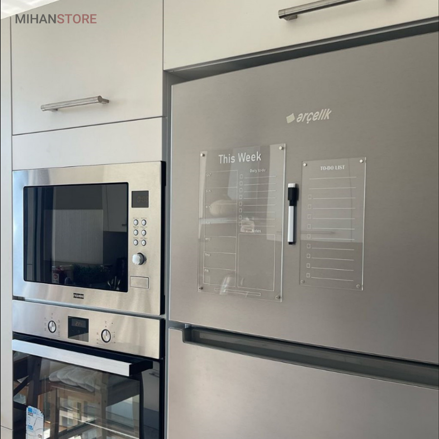 تخته برنامه ریزی هفتگی مغناطیسی شفاف این امکان را به شما می دهد تا با داشتن یک برنامه ی منظم هفتگی کارهای خود را سازمان دهی کنید.همچنین با داشتن بخش جزییات کارهای روزانه به شما در طبقه بندی، رسیدگی و انجام کارهای تان کمک می کند. امکان ثبت رویداد های هفته ،ثبت قرار ملاقات و دارا بودن بخش یادداشت های متفرقه از مزیت های این محصول است . پلکسی گلس اجرا شده در این محصول به ضخامت دو میلی متر است و در آن چهار عدد آهن ربای نئودیمیوم درجه یک بکار رفته است . آهن ربای این محصول با قدرت بالا نسبت به وزن محصول احتمال سرخوردگی را به صفر می رساند. طرح چاپ شده در دو رنگ سفید و مشکی در پشت پلکسی گلس اجرا شده است. با یک ماژیک وایت برد قابلیت نوشتن و پاک کردن مکرر روی این تخته وجود دارد.