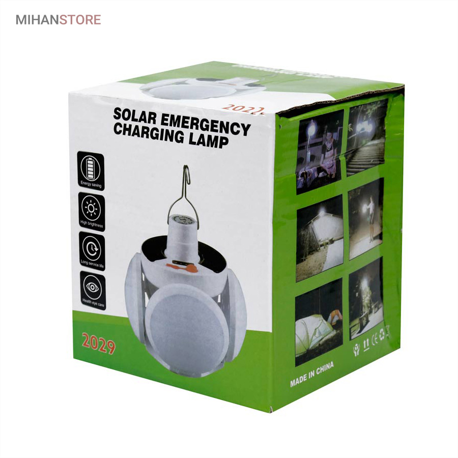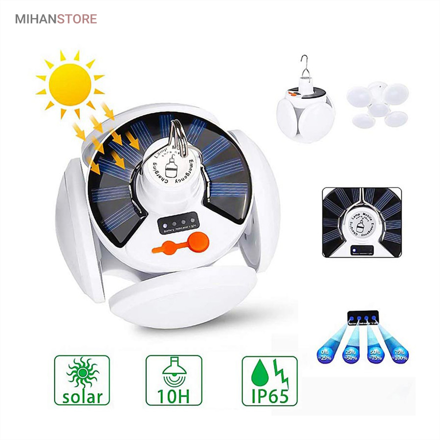 از ویژگی های دیگر این لامپ داشتن صفحه سولار می باشد و این خود می تواند بهترین کمک را در ذخیره انرژی داشته باشد، همچنین دارای میزان روشنایی 800 لومن و چراغ نشانگر شارژ در قسمت بالای لامپ نیز می باشد. منبع تغذیه لامپ توسط پنل خورشیدی و همچنین آداپتور می باشد. برای شارژ کامل لامپ، 5 ساعت زمان لازم است و با هر بار شارژ کامل، می توانید به مدت 6 تا 8 ساعت از نور آن استفاده کنید. باز شدن چهار ال ای دی این چراغ سولار زیبایی آن را دوچندان کرده است.سایز لامپ در حالت بسته (مدل توپ) 16x14x16 سانتیمتر میباشد در حالت سقفی باز 30x16x30 سانتیمتر می باشد.
