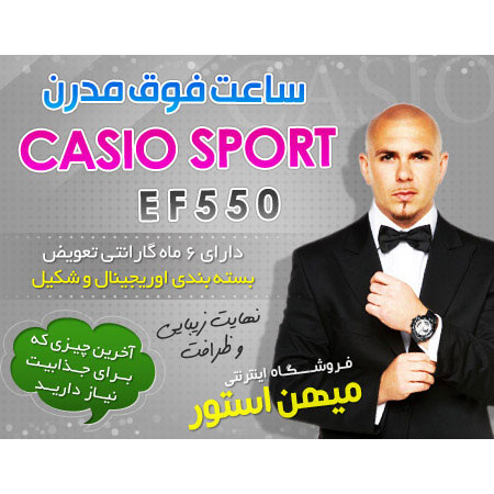 ساعت Casio Sport EF-550 یکی از جدیدترین مدل های عرضه شده شرکت Casio می باشد. این ساعت دارای روز شمار نیز می باشد و همچنین در بسته بندی اوریجینال با 6 ماه گارانتی تعویض عرضه می شود. از دیگر خصوصیات این ساعت صفحه ضد خش و ضد آب بودن آن می باشد.